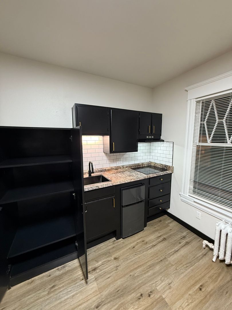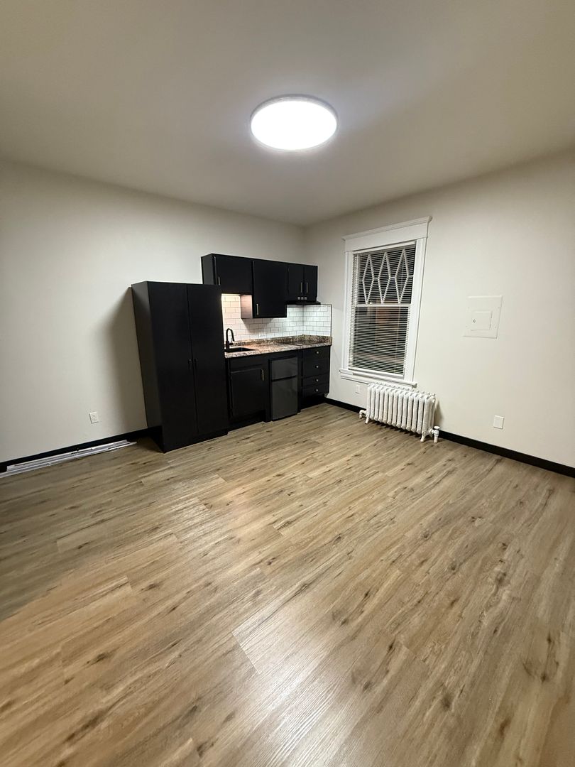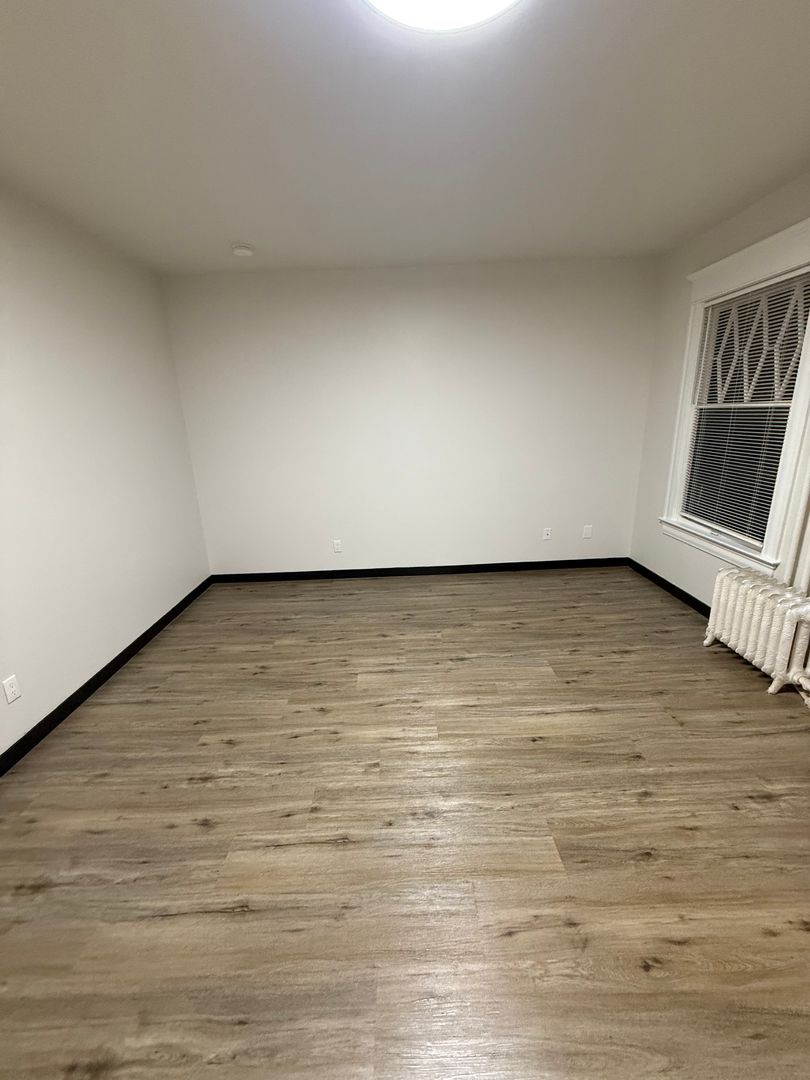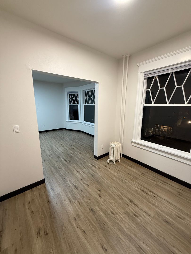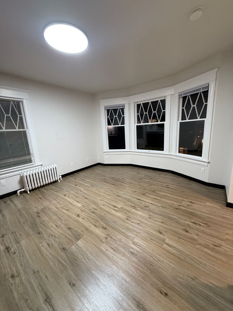 This newly renovated apartment offers a unique blend of modern comfort and classic charm. The unit features new flooring and under mount lighting, creating a warm and inviting atmosphere. The bay windows allow for an abundance of natural light, enhancing the overall aesthetic of the space. The apartment also boasts brass finishes, adding a touch of elegance to the unit.